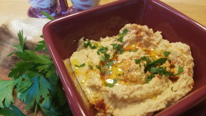 To Serve: Make a nice deep grove in the middle. Drizzle Olive Oil, parsley and Paprika.